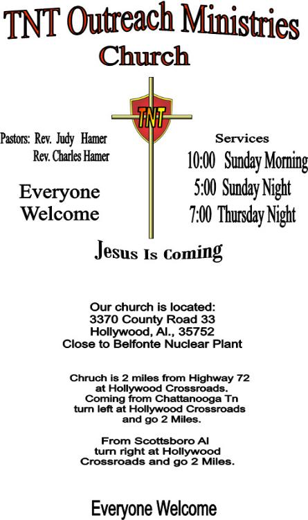 What can you believe for? God can do it. Jesus wants to save, deliver, and heal all those who will call upon His name. He died on a cruel cross and rose again from the dead, just for you. Reach out to Jesus today. Ask, knock, seek and He will open unto you. Nothing that you will ever go through is out of God’s control. Everything is in the hands of Jesus. He paid the price with His life. Let us know if we can pray with you for anything. Phone: 1-888-259-8056 Address: TNT Ministries P.O. Box 477 Hollywood, Al., 35752 |